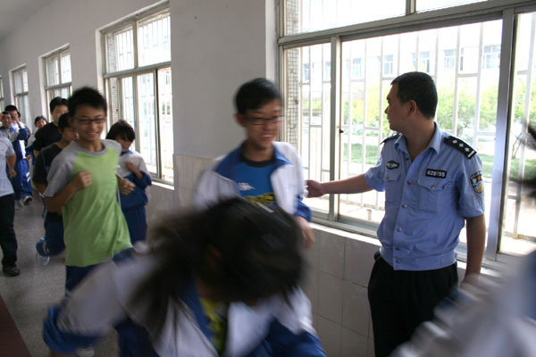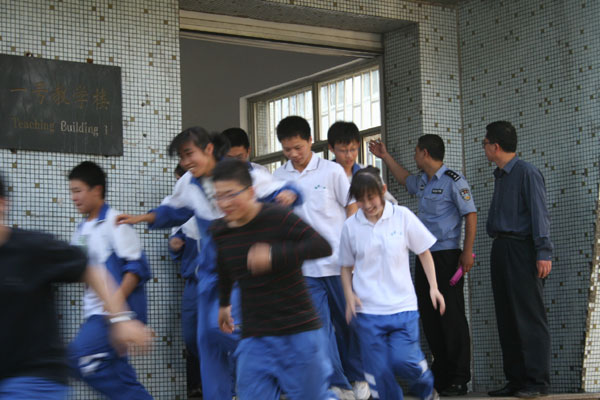 为了保证防震疏散演练活动的顺利进行,学校成立了专门的领导机构,做了详尽的演练前的研究和宣传工作,制定了“淄博一中防震疏散演练实施方案”,提出了“严肃、安全、认真”的演练总要求。5月12日下午4点30年级分管领导分年级召开班主任培训会,统一思想、端正态度、明确任务、祥解疏散演练的全部过程,随后由班主任到各班向学生讲解演练的要求、具体过程、疏散方式、疏散路线,并与学生一起反复练习、熟悉疏散路线。5点30分,随着防空警报的响起,参练学生按要求迅速出门,分两路纵队有秩序地冲下教学楼,并快速集结到预定安全地带,4000余名学生在90秒时间内既全部集结到安全区域,顺利完成第一次疏散演练。第一次演练结束后,学生迅速回到教室,校园瞬间安静下来。5点50分,警报声再次突然响起,正在上自习课学生,迅速反应,以更有序、更快的速度向集结地撤去,用更短的时间完成了第二次疏散演练。