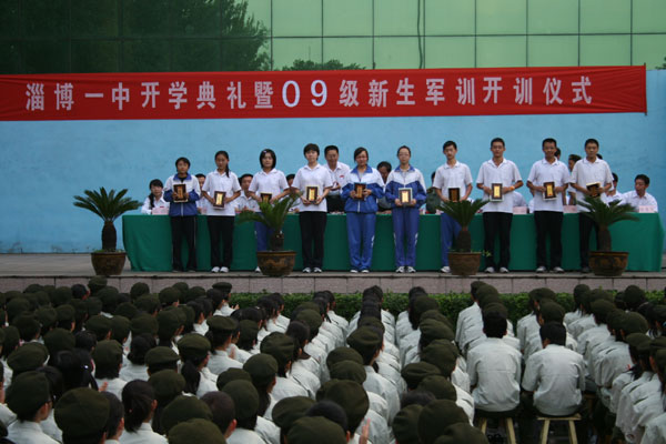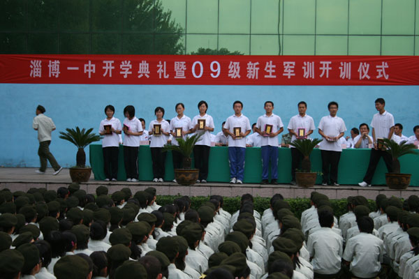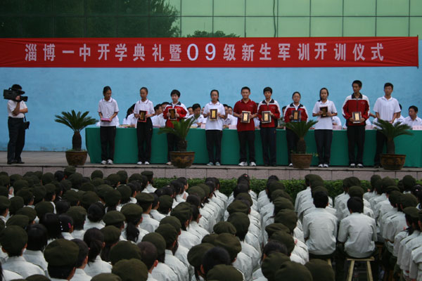首先,由胡波副校长宣读《淄博一中关于表彰2008-2009学年度学校“四有”标兵暨首届“十佳”中学生的决定》,学校领导班子成员向10名“四有”标兵称号获得者,高2008级、高2007级、外语学校各10名“十佳”中学生颁发了获奖证书和奖品,“四有”标兵代表谢楠同学作了表态发言。