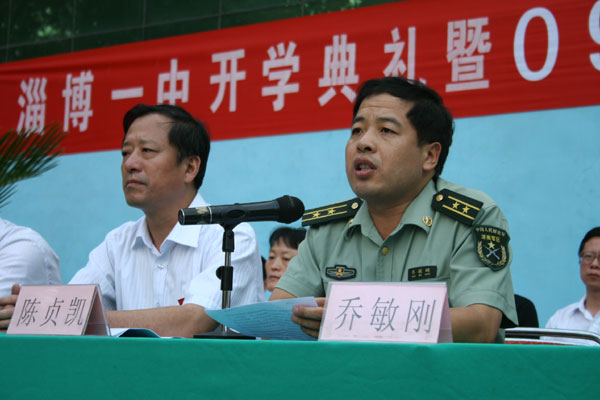 陈贞凯校长发表讲话,他首先代表全校师生向区人武部的领导和全体参训教官表示衷心的感谢,向升入我校的优秀学子表示诚挚的欢迎。他指出,新学期学校德育工作的重点是继续围绕“学会做人,学会求知,学会生活”的育人目标,教育引导同学们做“感恩的人,和谐的人,诚信的人,有责任的人,有修养的人”,通过各种形式培养大家良好的道德品质和健全人格,教育处和班主任将加大《学校关于进一步强化教育常规管理意见》的实施力度,重点抓好发型服饰、男女生过密交往、校内使用手机、网络文明、同学之间和谐相处、餐厅秩序等热点问题,对违规违纪同学从严处理。特别需强调的是,《山东省学生基础素养评价方案》已全面实施,评价结果对高中毕业、高考录取等产生直接影响。今年高考录取,不少大学对综合素质评价成绩差的采取降低专业层次和拒录措施,如临沂师范学院对十几名评价低的同学不予录取。请同学们明确评价内容,按规定要求自己,争取毕业时不仅有好的高考成绩,更要有高的评价成绩。全校各个年级都有不同的学业任务要求,尤其是毕业班的同学,高考和中考是人生的重要选择,要确定好个人奋斗目标,奋斗一学年考上理想的大学和高中,实现自己的梦想。高中非毕业年级面临学业水平考试和学年模块统考,要按照新课程方案要求,全面完成必修课程,尽可能多一些选修课程。在学习中不断提高方法、素质、能力。现在高考命题已逐步趋于新课程要求,趋于素质和能力考察。只有在平时打好基础,才能应对高考。各种综合实践活动是全面提高的重要途经,请同学们按学校安排要求,主动参与学校组织的各项活动。他强调,今年10月18日我校将举行建校85周年庆典。届时,海内外校友将云集母校,名校友将与同学们座谈交流。学校还将组织一系列校庆活动,在校的同学赶上校庆庆典是非常荣幸的,大家要以实际行动、优异成绩为校庆献礼。通过校庆活动,增强一中人的自豪感和荣誉感,实践“今天我以一中为荣,明天一中以我为荣”的誓言。最后,他代表学校向同学们提出了五点希望:一是要有远大的理想和目标。有人说得好,生活的理想就是为了理想的生活,人生的价值就是为了创造有价值的人生。理想可以产生动力,可以规范行为,可以改善自己的学习与生活,没有远大理想和明确奋斗目标的人,不可能成为社会的栋梁。请同学们尤其是高一新生开学后,都要按学校要求做出人生发展的规划,确定奋斗目标,并制定实现目标的具体措施。二是要有健康的体质和心态。健康的身体素质和心理素质是一个人成功的重要基础条件。没有良好的体质和心态,在今天不可能很好地完成繁重的学习任务,将来也不可能担当大任,成为社会的英才。因此,同学们应当从每一天做起,通过坚持不懈的锻炼和科学的调适,使自己保持健康的体魄和良好的心态。作为高一的新同学,军训是高中的第一课,你们要以饱满的热情投入训练,以勇争第一的精神状态完成训练任务;听从教官指挥,勇于吃苦,乐于吃苦;尤其要强化安全意识,杜绝伤害事故的发生。三是要有良好的品质与修养。要有感恩之心、敬畏之心、宽恕之心、博爱之心,要树立尊重意识、责任意识、规则意识、进取意识。志向高远,品德高尚,行为高洁,谈吐高雅,彬彬有礼,学识高超,处处体现淄博一中学生应有的内在素质和外在形象。四是要有必需的知识和能力。知识是基础性的,能力主要是指学习能力和实践能力,也包括应对不同环境的生存能力。这知识和能力,在今天,是你们如愿进入优质高校深造所必需的;在以后,则是你们作为社会栋梁履行为大众服务的社会责任所应必备的基础。五是要有科学的学习计划。“凡事预则立,不预则废”。新课程方案要求同学们要在高中阶段完成八个学习领域、十七门的必修课程,另外还有大量的选修课程。在规范办学的今天,每年的假期和双休日共计174天,在校学习期间每天的自习时间为1/3,要求同学们一定规划好每一周、每一天、每一节课,谁支配好了时间,谁就有高质量学业成绩的主动权,谁就赢得人生。合作探究、交流、自主学习能力的培养对高一学生尤为重要,要尽快转变学习方法和习惯,适应高中学习和生活要求。有人说人生只有三天:“昨日、今日、明日”,昨日我们不曾虚度,今日我们播下希望的种子,明日我们才会梦想成真。