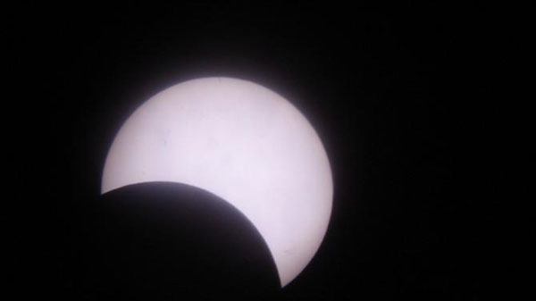 当天,校园内,天文小组的同学组织用单筒望远镜投影观看日偏食。小朋友、初中生、高中生、老师们共同欣赏着宇宙盛宴。