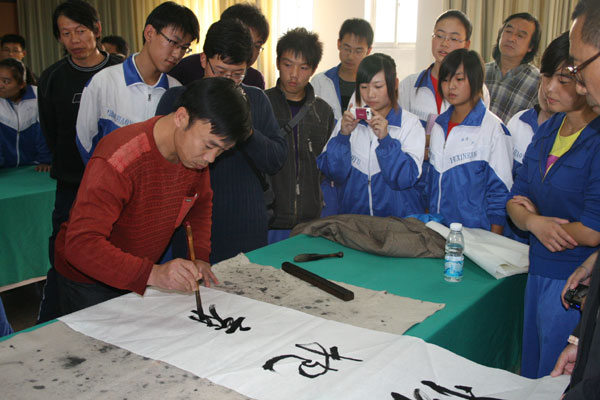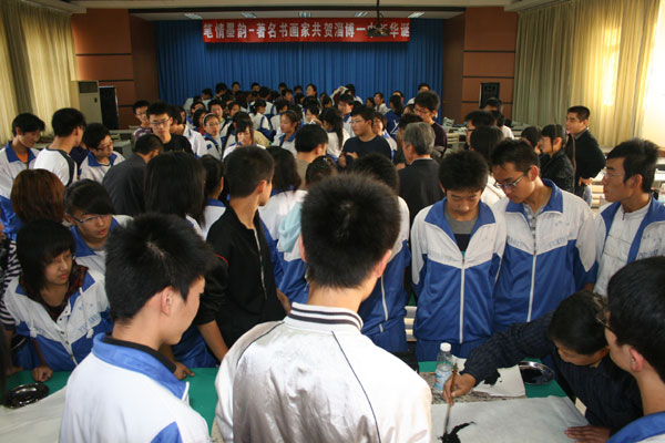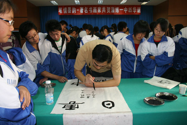 笔情墨韵——书画家光临我校,共贺85华诞 日期:2009-10-16 来源:本站 X 10月15日,我区14名国家、省、市级书协、画协的部分领导、书画家光临我校,共贺我校85周年华诞,挥毫泼墨与我校书法、绘画爱好者交流,并为我校留下了宝贵的作品。