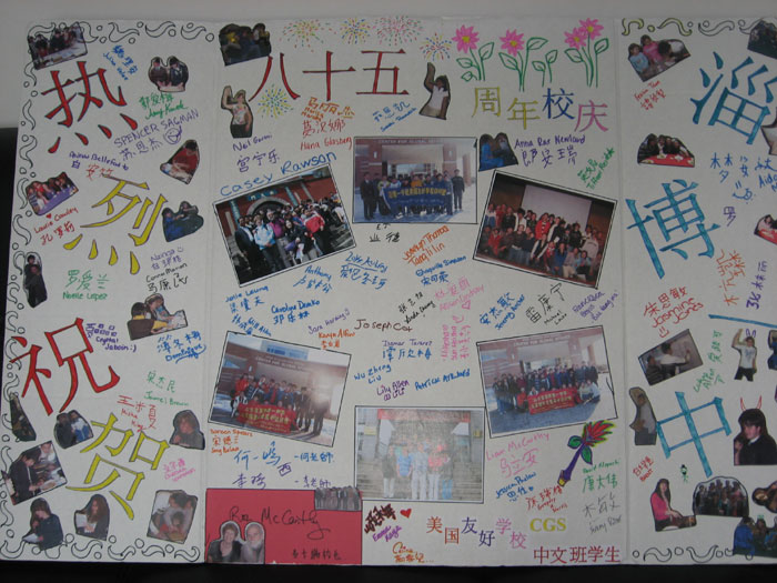 海报长1.2米,宽80公分。在这张海报上,用汉字写着“热烈庆贺淄博一中八十五周年校庆”的彩色文字,点缀着我校师生和美国友好学校师生历年来的友好交流的活动六幅图片,其中有今年陈贞凯校长陪同美国麦克曼高中新任校长麦卡锡夫人同登泰山在南天门的合影,象征着两校的交流又登上了新的高峰;有2007年、2009年我校师生友好访问团在美国麦克曼高中的合影;还有美国友好学校师生在我校访问时的合影。他们还在空白处写上自己的中文名字和英文名字,贴上了自己的照片,似乎在说:我爱中文!我爱中国文化!