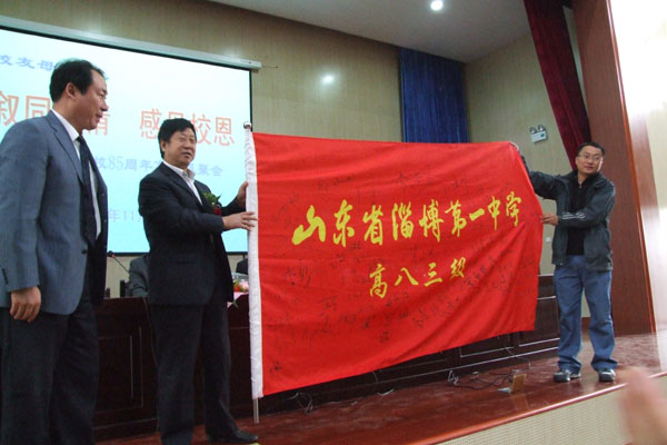 11月1日,在淄博一中85华诞喜庆气氛里,高八三级校友荣归母校欢聚一堂,畅叙同学之谊,共贺母校85载辉煌,祝福母校美好明天,并捐赠价值10万元图书,以表感恩母校之情。