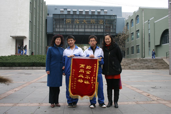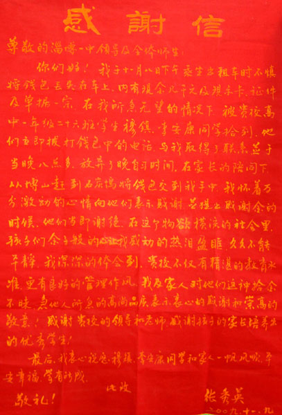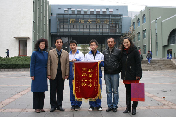2009年11月8日傍晚,我校高2009级26班穆镇、李安康两位同学在放学途中捡到一个钱包,内有现金几千元,另有银行卡数张、身份证、驾驶执照等多种证件、票据。两人在穆镇父母的陪同下,经多方打听,终于和失主取得联系,并连夜将钱包送至15公里外正焦急万分的失主手中,并婉拒了失主给钱和请吃饭的谢意。第二天,被深深感动的失主来到学校,给学校送来锦旗和感谢信,并激动的和两位同学、徐校长以及班主任郗和睦合影留念。失主不止一次表示:现在捡东西归还的人真的是越来越少,两位同学真是太好了!这说明老师教育的好,也可以看出咱一中优良的校风就是名不虚传。13日,淄博交通文艺广播电台等媒体专门对两位同学进行了采访,进一步弘扬两人拾金不昧的精神,并奖励每人现金100元。