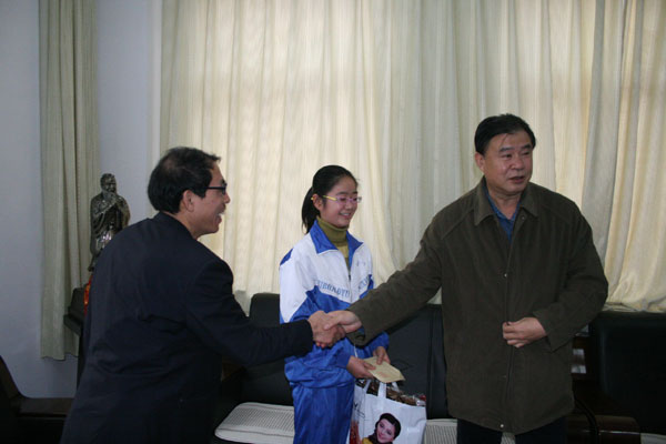12月8日上午,天空下着蒙蒙细雨,天气有些寒冷,但淄博一中的接待室里却充满了温暖。淄博市原广电局局长任鹏雁专程来到我校,看望高2009级25班的张莹同学,给张莹同学带来了两千元的学费,并购置了冬季服装。
