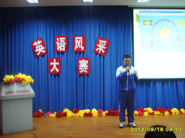 由高一英语组承办的学校第二十一届艺术节重要项目之一的英语风采大赛(高一专场)正在紧张热烈地进行,整场比赛高潮迭起,精彩纷呈,会场内众多同学热情参与,掌声此起彼伏。