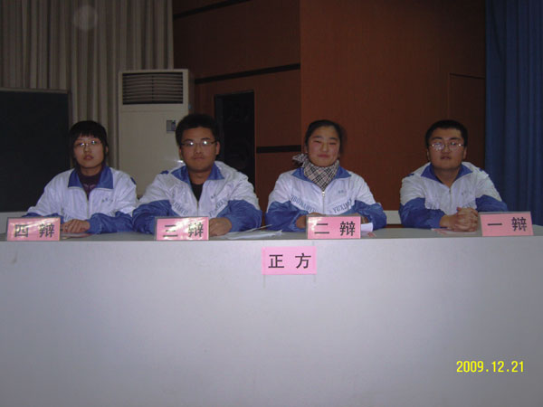 作为学校第二十一届艺术节重要项目之一的高2009级辩论会,于12月21日晚7点在信息图书楼科技报告厅举行,正反辩方以“合作与竞争谁更能促进中学生发展”为辩题进行了一场激动人心的辩论。两队辩手旁征博引,引经据典,你争我辩,妙语横生。特别是在当前学校进行新一轮课堂改革的影响下,双方辩手能够将小组合作学习模式渗透到辩论之中可谓是一大亮点。整场比赛高潮迭起,精彩纷呈,集思想性、逻辑性、明辩性、前瞻性于一体,吸引了众多同学的热情参与和阵阵掌声。尤其在观众互动环节,现场的同学们积极发言,场内气氛十分热烈,辩手敏锐的洞察力和逻辑清晰的雄辩将辩论赛推向高潮。