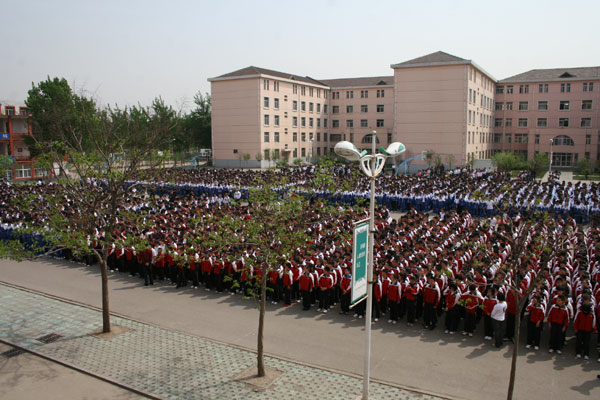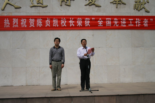 5月4日上午升旗礼,全校师生在西校区博爱广场隆重集会,热烈祝贺陈贞凯校长被授予“全国先进工作者“光荣称号。