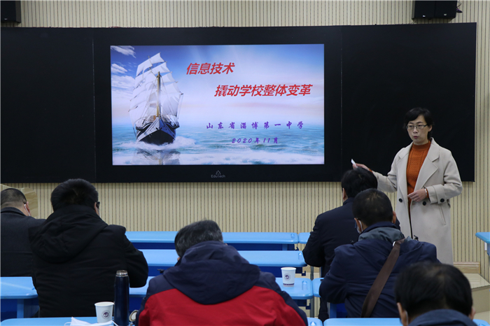 来访嘉宾参观了博学楼教学班级,体验了校园各项功能设施,重点就我校信息化建设规模、配置层次、教学应用等进行了考察。在博学楼自动录播室观摩董广陆老师执教的物理公开课《受力分析》。教务处副主任盖晓琳以《信息技术撬动学校整体变革》为题做演讲汇报,介绍了我校七年来全面推进智慧校园建设的历程,交流了智慧学习环境下教师技术工具运用、资源平台和交互系统支持下的授课、备课和辅导等情况。