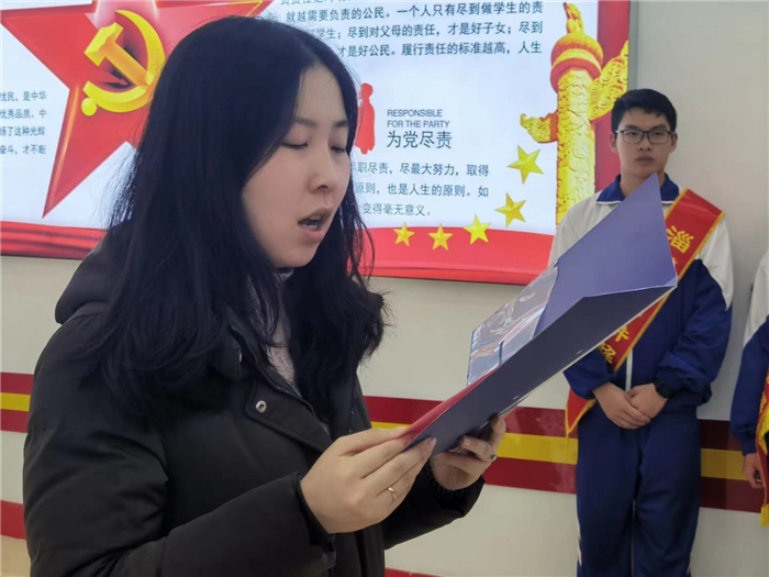 举行“学党史 祭英烈”主题团日活动。在红色记忆馆,教师代表耿慧做题为《学党史,祭英烈,砥砺奋进》的讲话,她和同学们一起回顾了中国共产党走过的峥嵘岁月,并希望同学们要传承先烈们的革命精神,发扬革命光荣传统,从身边做起,从小事做起,心怀奉献,积极进取,励志勤学。在庄严的仪式中,同学们高举右拳,在鲜艳的团旗下庄严宣读入团誓词,铿锵有力的誓词回荡在现场每一位团员心中。