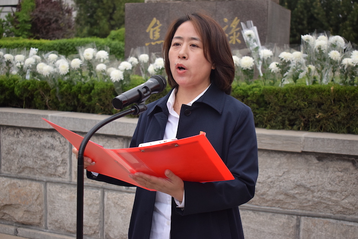 仪式开始前,团员代表怀着无比崇敬的心情向焦裕禄塑像敬献鲜花并鞠躬。