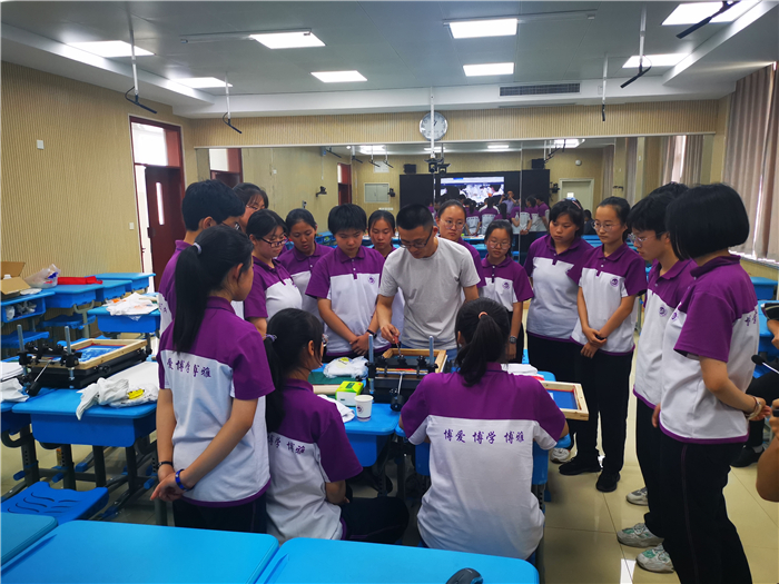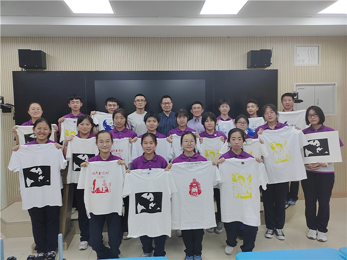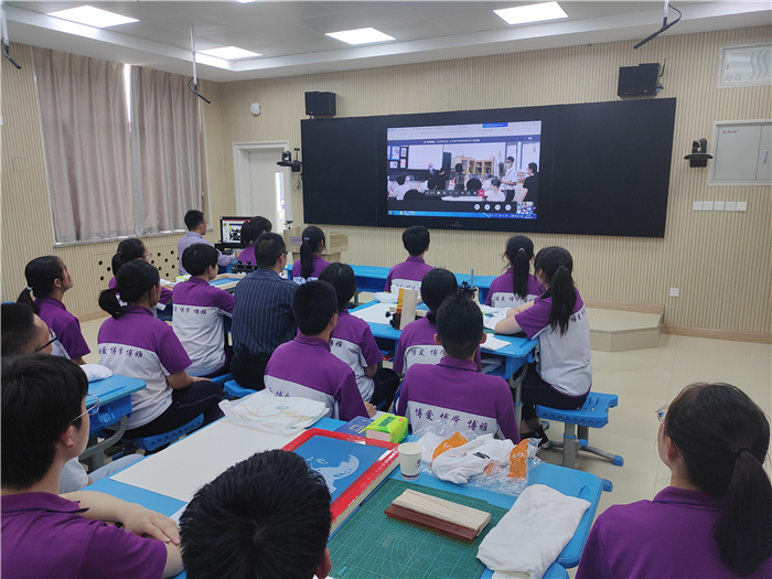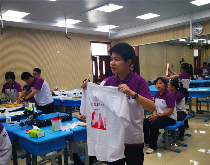 在线上交流中,港方教师讲解了版画制作的种类和日常教学过程中同学们的优秀作品,我校教师讲解了丝网印刷的有关知识,并做了示范。随后双方师生共同围绕主题进行创作,两校同学共同完成作品,学生代表对自己的作品进行了讲解,英皇书院的同学以山东地图为创作素材,表达了对齐鲁文化的向往,我校同学则以邓小平头像和香港景观为素材,阐述了对一国两制的理解和对香港的美好祝福。双方将把自己的优秀作品邮寄给对方留作纪念。
