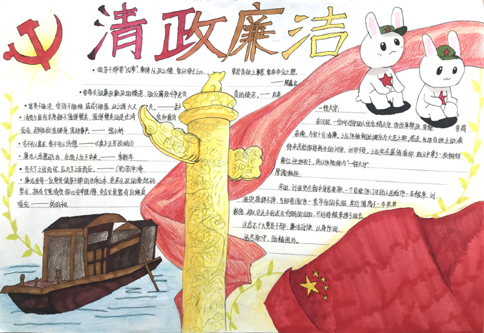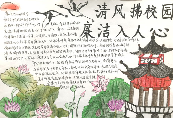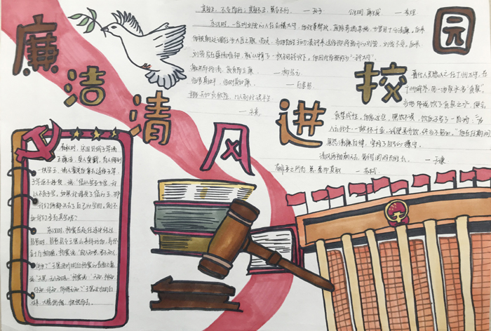 开展手抄报比赛,以图绘廉,以文述廉。作品紧扣校园廉政文化主题,有廉洁格言警句,有廉洁的文化内涵,有廉洁小故事等,让学生接受廉洁文化的熏陶,在内心深处播下廉洁的种子。