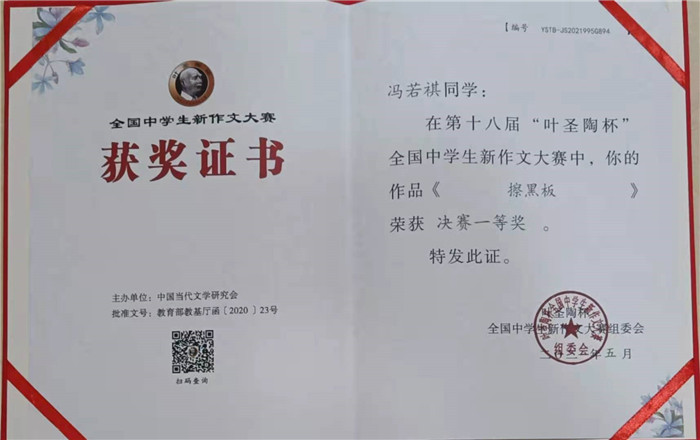 近期,我校洗凡文学社喜讯频频,收获颇丰。继4月份《作文与考试》杂志对我校洗凡文学社专版推介之后,又有5名同学在第十八届“叶圣陶杯”全国中学生新作文大赛中获奖。2019级冯若祺同学荣获全国决赛一等奖,其余四名同学荣获全国决赛二等奖。2018级杜昕冉作品《我们一起走过》发表于《漫维》杂志2021年第5期。《红楼梦》整本书阅读活动持续推进,2021级夏侯姝汎同学的研读感悟刊发于《作文通讯》2021年第6期。