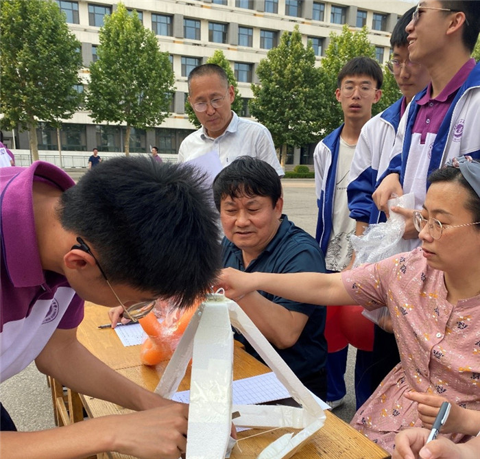 为保护鸡蛋,同学们在赛前认真查阅多种资料,学习掌握自由落体运动、牛顿第二定律、功能关系、动量定理、动量定理等相关知识点;以小组为单位,集思广益,反复分析推敲实验方案,尽可能地完善自己的作品。比赛时,一个个凝聚着同学们心血的作品依次从博爱楼二楼降落,与“地球”的每一次撞击都让现场的师生们心潮澎湃。评委老师现场对同学们设计的作品从外观、轻重、原理等方面进行评分,最终共评选出一等奖3组,二等奖4组、三等奖5组。