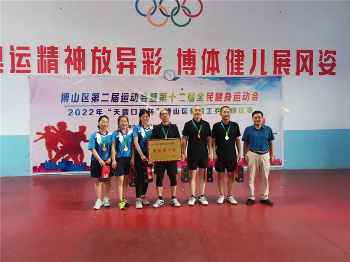 近日,博山区第二届运动会暨第十二届全民健身运动会2022年博山区教职工乒乓球比赛圆满结束,我校刘可翔、梁慎超、谢成谟、郭宁、赵叶红、逯慧组成的代表队参加比赛并获团体第一名。郭宁获女子单打第五名。