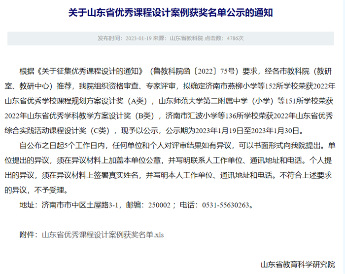 近日,山东省教育科学研究院公示山东省优秀课程设计案例获奖名单。我校推荐的三个课程设计案例均获奖,其中,《学校课程规划方案》荣获山东省优秀学校课程规划方案设计奖(A类),《运动与相互作用》荣获山东省优秀学科教学方案设计奖(B类),《走进博山非遗,传承活化文脉》荣获山东省优秀学科教学方案设计奖(C类)。