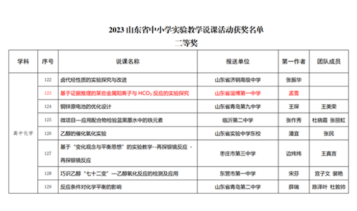 2023年淄博市中小学实验教学说课评选活动中,我校化学教研组孟雪老师荣获一等奖,并代表淄博市参加山东省中小学实验教学说课大赛。