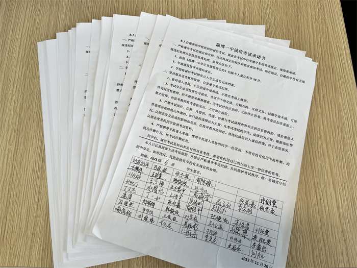 主题升旗仪式上,班主任组长刘天棋代表教师发言,呼吁同学们以诚信的态度对待每一场考试,诚实地回答每一道题,为心灵交一份诚实答卷。随后进行的宣誓仪式上,学生会主席于文恒带领全体同学庄严宣誓:“我宣誓:勤奋学习,全力以赴。牢记嘱托,不忘初心……诚信考试,不负青春。”各班利用班会时间组织同学们签订《诚信考试承诺书》,进一步明确考场纪律和考试规范,强化了对诚信考试的承诺。
