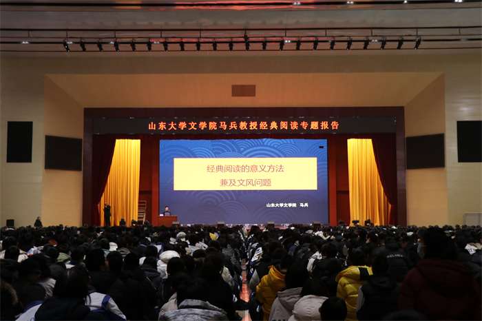 报告会上,马兵教授围绕“文学何为”、“什么是好的文风”、“什么是阅读的‘小道’与‘大道’”、“阅读能力如何有效提升”等系列问题,列举同学们熟悉的经典作家作品,引导大家正确认识与对待文学,端正文风;强调课堂学习要扎实,掌握必要的阅读能力与技巧;注重做好文学史常识的积累,处理好通读与细读的关系;掌握运用经典解读的方法,进行深入的经典阅读,比较快捷地找到自己与作品对话的方式。在互动环节,同学们踊跃提问,马教授一一认真解答,将报告会推向高潮。马教授的报告高屋建瓴,深入浅出,引导同学们在经典阅读的海洋遨游,报告现场鼓掌喝彩连连。