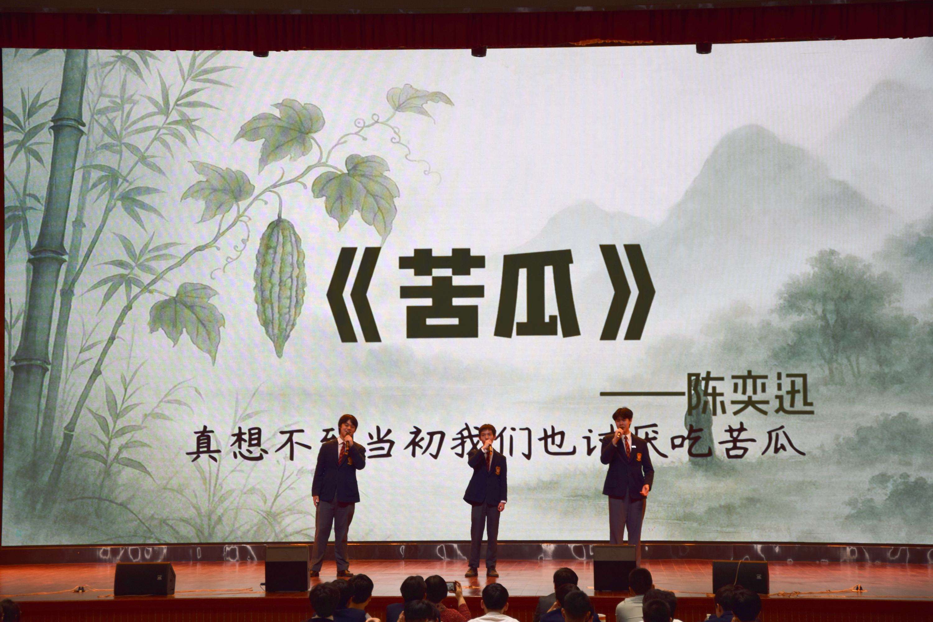 今年的朗诵会尤为特殊,除一中学子外,还有来自西藏、香港两地的学子共赴盛会。西藏日喀则齐鲁高级中学的学子们披盔戴甲,豪情满怀,酣诵一曲《满江红》,引来满场欢呼。虽远隔千里,他们难以到场,但通过视频仍能充分感受到他们满满的诚挚与热情。《给苦瓜的颂诗》则为朗诵会注入理性与深沉,来自香港英皇书院的三位学生将人生的思索娓娓道来,给融融春日带来一抹清凉,结尾共唱歌曲《海阔天空》更引来阵阵喝彩。