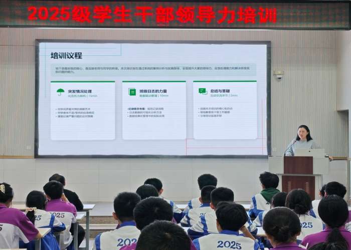 年级教育处负责同志围绕“责任与担当:学生干部领导力提升”主题,从突发情况处理、班级日志管理与数据分析、班干部角色定位等方面进行了系统讲解。强调,学生干部是班主任的得力助手、同学的服务先锋、班级的领航员,要时刻牢记“安全第一、冷静沉着、分工协作、及时汇报、客观中立”的突发事件处理原则,掌握矛盾调解、应急响应、课堂纪律维护等实操技能;要充分发挥班级日志的客观记录功能,及时汇总、科学分析相关数据,用数据驱动管理,提升班级治理的实效性。