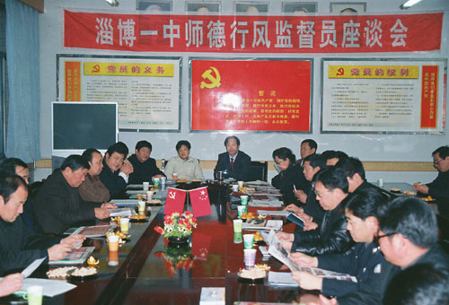 12月29日,我校隆重举行师德行风监督员座谈会,博山区大班子领导宋元爱、岳永禧、任英华以及来自社会各界的监督员近30人出席,陈贞凯校长作2005年工作汇报,学校领导班子成员参加座谈。