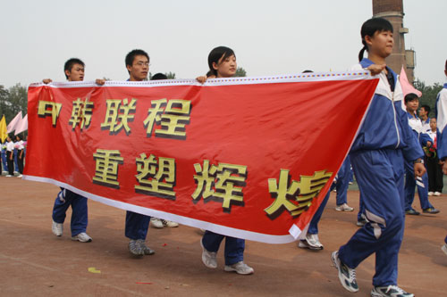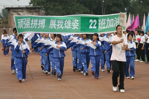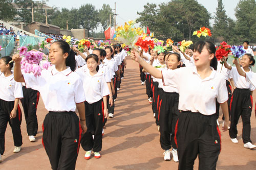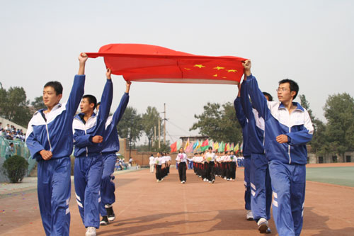9月28日下午,我校第九届体育节田径运动会开幕式隆重举行,区人大常委会副主任张荣孔,区政协副主席岳永禧,区广电局局长王新生,区文明办主任李安臣,区委宣传部副部长程涛,区文化局副局长李同福,区电视台台长郭平,博山六中校长李效荣,博山七中校长张建国等领导和我校校级班子成员、离退休老同志代表在主席台就座,艺体处主任赵玉明主持开幕式。
