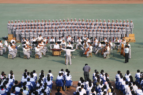 开幕式上,博山区管弦乐队与学校合唱团共同为师生演出了《长征组歌》,以纪念红军长征胜利70周年。同时,学校武术队、健美操队也进行了精彩表演。