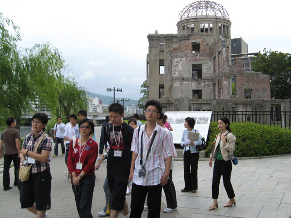 接下来的四天时间里,各分团先后离开东京赴各地。我们乘日本国内航班远赴广岛。广岛因二战时期遭受第一颗原子弹爆炸而成为著名的国际城市。首先来到和平纪念公园,这是在原子弹爆炸中心区域原址上建成的。1945年8月6日上午8时15分,人类史上第一颗原子弹在广岛市中心约580米的上空爆炸。它使广岛市街在一瞬之间化为焦土,夺去了十数万市民的生命,所有城市机能遭到毁灭性的破坏。原子弹墓栋,从老远便能看到。这本是广岛内第一优美的标志性建筑物,原子弹爆炸后,楼顶和楼内一切荡然无存,只剩下四周垣墙顽强地支撑在那里。人们把它保留下来,昭示着这场灾难和这段历史。