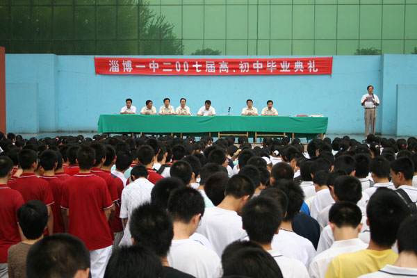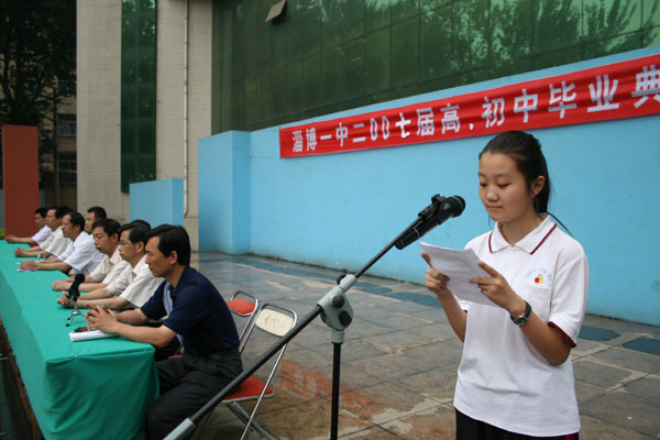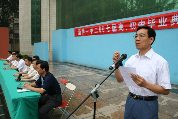 在向圆满完成了高、初中学业的毕业生表示热烈祝贺,向辛勤工作的老师表示衷心感谢之后,陈校长指出,在淄博一中这所有着83年光荣历史的校园里,在"治学严谨、学习扎实、生活丰富、文明充盈" 的校风熏陶下,在老师们的耐心指导下,你们懂得了做人的道理,提高了自理的能力,掌握了学习的方法,养成了良好的习惯。你们中很多同学抱负远大,追求真理、渴求进步,有近700名同学向党组织递交了入党申请书,周文静等10余名同学被评为省、市级三好学生、优秀学生干部。成果的取得,凝聚着老师的汗水、家长们的爱心,更凝聚着同学们的勤奋和努力。
