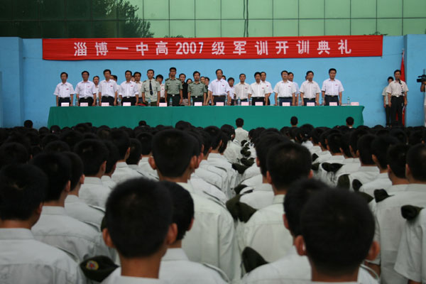陈贞凯校长发表讲话,他首先代表全校师生向区政府、区人武部的领导和全体参训教官表示衷心的感谢,向从全省、全市各区县、各中学升入我校的1510名优秀学子表示诚挚的欢迎。他指出,我校是一所有着光荣历史和辉煌业绩的老牌名校,创建于1924年,1955年被确立为省重点中学,1992年成为山东省首批规范化学校,2006年被评定为山东省首批普通高中教学示范校,迄今已走过了83年的光辉历程。历经近一个世纪的办学实践,学校铸就了“严谨、求实、团结、进取”的一中精神,形成了艰苦奋斗、勇于改革、开拓创新的个性,树立了“发展是硬道理”的坚定信念,以“教风严、学风正、校风好、教育教学质量高”受到社会各界的广泛赞誉。教学质量在全市一路领先,是淄博市唯一的高中样板学校:高考本科上线人数先后在全市率先突破500名、700、1000名大关,保持最高记录。1993年,郑晓亮同学获25届国际化学奥林匹克竞赛银牌,实现了淄博市国际奥赛“零”的突破。1998年,赵文发夺得全省“理科状元”桂冠。自2001年以来,连续7年夺得全市高考本科上线人数第一名,其中孙婷婷、栾静、周文静同学分别荣膺03年、04年、07年全市理科状元桂冠。今年高考:本科上线录取1064人;一、二批上线人数和上线率在全市均列第一;周文静等6名同学被北大、清华录取。他强调,作为步入高中生活的第一课,军训是对学生进行国防教育、实施素质教育的一个重要形式,对激发同学们爱国热情,增强集体主义、组织纪律观念,磨练坚强意志,增进吃苦耐劳精神等方面将起到关键作用。历届受训的同学都深深体会到,军训对以后的学习、工作和成才奠定了基础。希望同学们要以饱满的热情投入训练,以勇争第一的精神状态完成训练。要虚心向教官学习,听从教官的指挥,勇于吃苦,乐于吃苦。要强化安全意识,无论是课上还是课下,安全必须放在第一位,严格杜绝伤害事故的发生。