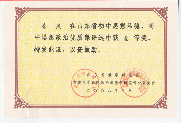 2008年4月13日—16日,山东省思想政治优质课评选活动在潍坊一中举行。本次活动由省优质课评委会依据统一制定的思想政治课堂教学评价指标,对各市推荐到全省参加优质课评选的课,采用现场讲课、评课的方式,进行了认真评选。高中部全省共有36名教师参加评选,由我校教师李燕代表淄博市政治教师参选,最终不负众望,荣获山东省思想政治优质课一等奖。