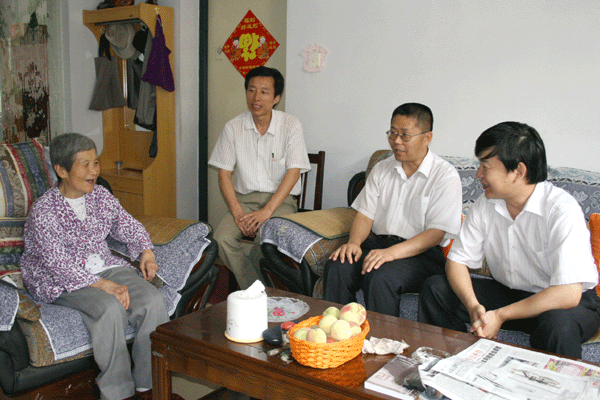 7月4日,受市总工会委托,市教育局党委委员、市教育工会主席赵泮利在市教育工会副主席郑伟陪同下来到我校,亲切看望全国劳模、退休教师刘爱华,并将2000元慰问金送到刘爱华老师手中。学校领导司志宏、张业玉、孙希刚陪同活动。