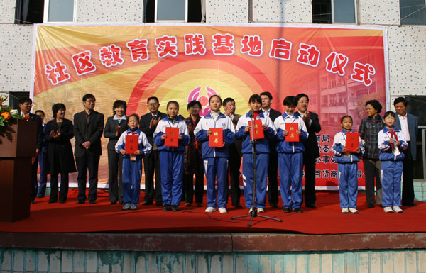 11月8日上午,博山区“社区教育实践基地”启动仪式在考院小学隆重举行,区委、政府、区教育局、城东办事处及部分学校领导出席会议,学校校党委司志宏书记出席仪式并参与活动。启动仪式上,我校高2008级学生会主席王琪同学被聘为“社区小主任”。