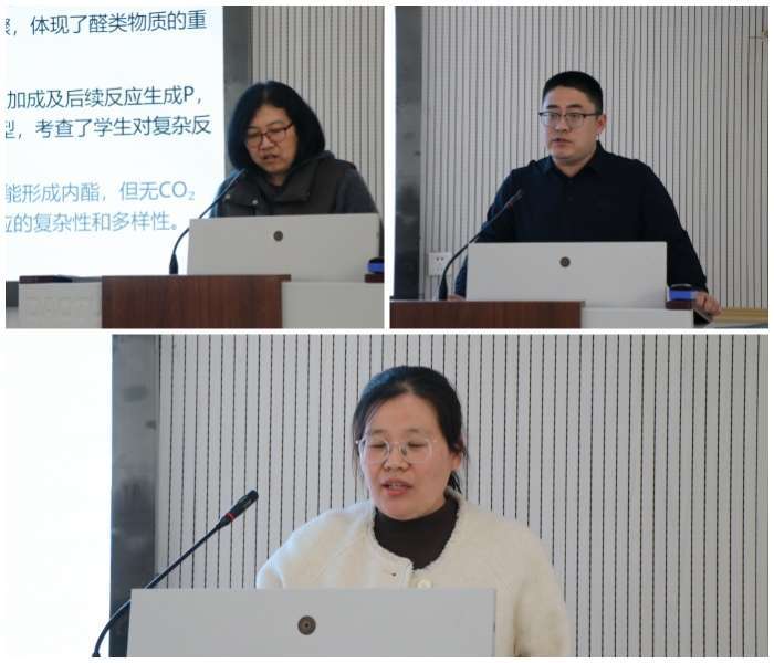 在专题交流环节,淄博一中王小兵老师以《新课标下有机化学教学策略》为题,桓台一中高文科老师围绕《物质结构与有机化学模块实验题呈现分析与教学策略》,淄博实验中学孟会燕老师就《新课标背景下物质结构与性质教学建议》分别作分享。三位教师结合高考命题趋势与教学实际,深入剖析模块教学要点,提出了切实可行的备考与教学建议。